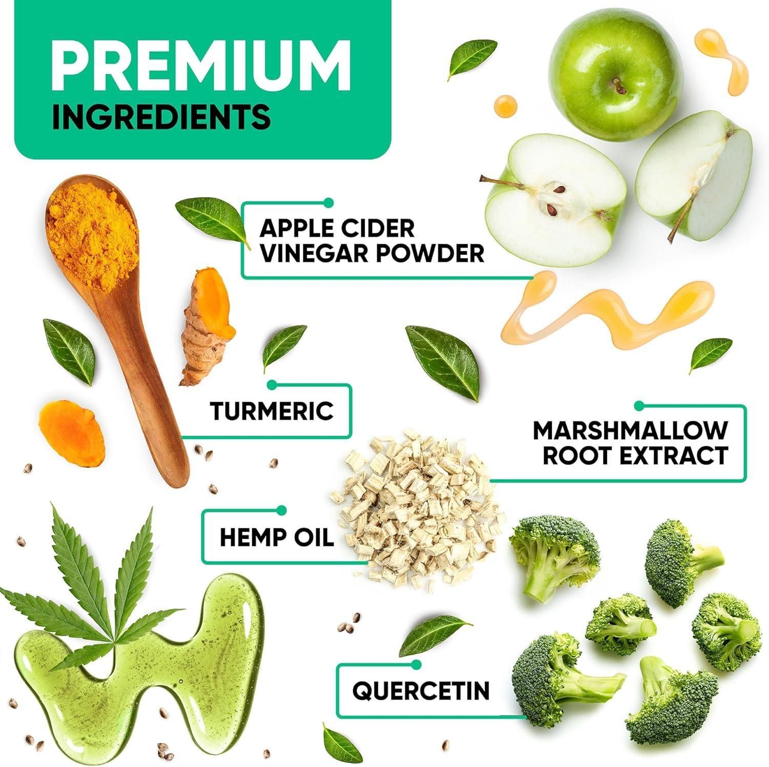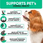 2.probiotics. human-grade ingredients: kinpur petcare chews optimize digestion, immune function and gut health through effective formula. every chew has vitamin infused superfoods like hemp oil, acv and turmeric. also, quercetin and colostrum add antihistamine effect. premium canine care: we combine veterinary research and high quality ingredients. soft, easy-to-chew bites w/ duck flavor will satisfy even picky eaters! this formula is suitable for puppies and senior dogs, and for dog