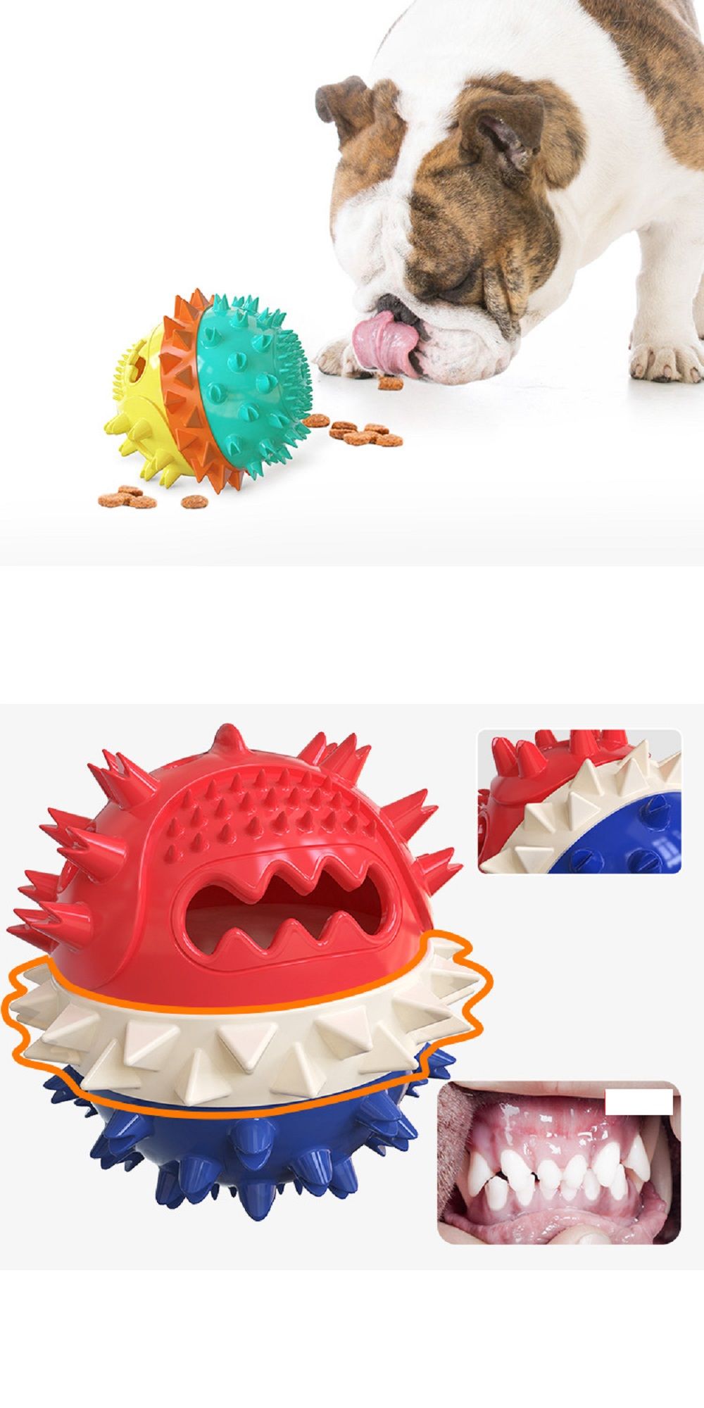1.[4 In 1 Multifunctional Ball] Upgraded Molar squeaky bouncing treat ball with bite cotton rope, food dispensing ball, designed with large sphere, thick sphere wall, which can more resist to dog's biting, there are multiple molar bumps that can fully protect dog's dental health.
